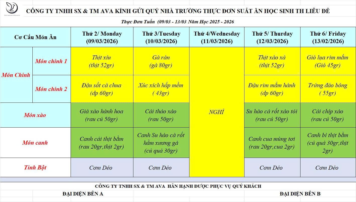 Thực đơn bán trú tuần 26